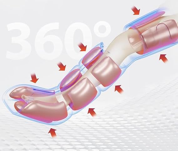 O grande diferencial da F10 Pro é seu sistema de compressão pneumática 360°, distribuído em 5 câmaras independentes por bota. Esse formato permite que a massagem envolva completamente a perna, promovendo um efeito sequencial que: