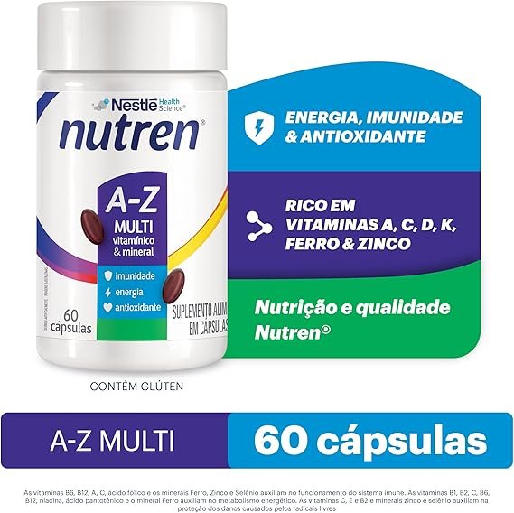 O Nutren A-Z é um suplemento multivitamínico e mineral em cápsulas, desenvolvido pela Nestlé Health Science. A proposta do produto é fornecer nutrientes essenciais do complexo A a Z, contribuindo para a saúde do corpo como um todo.